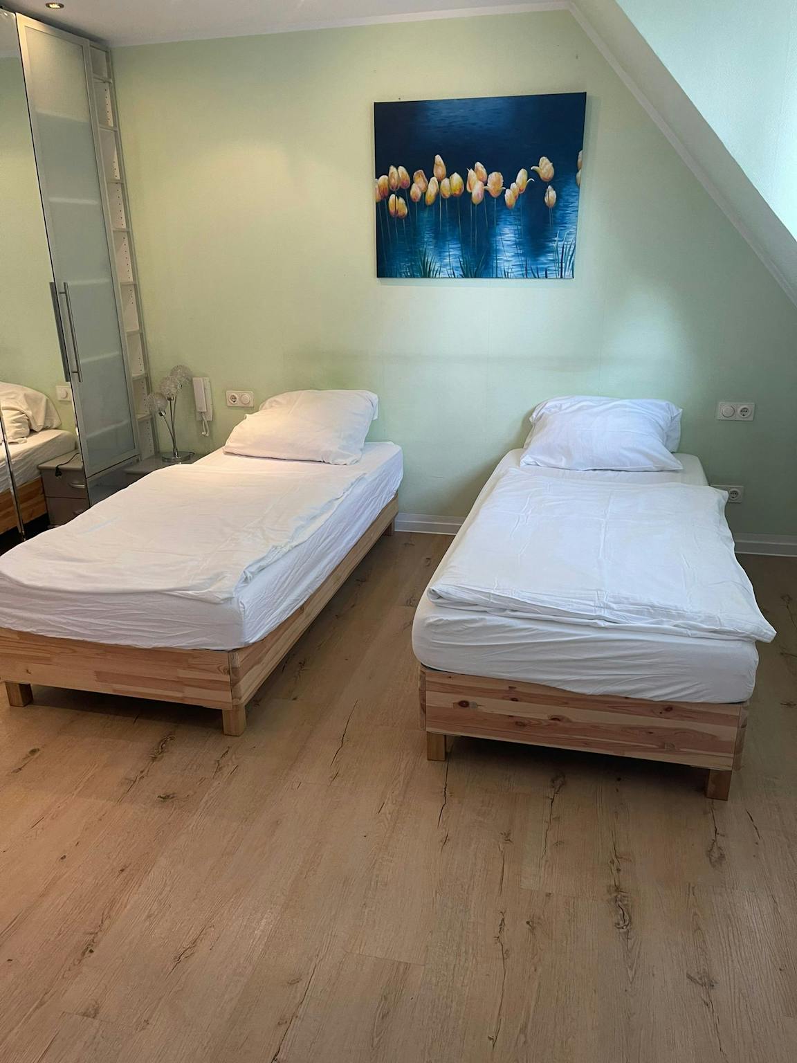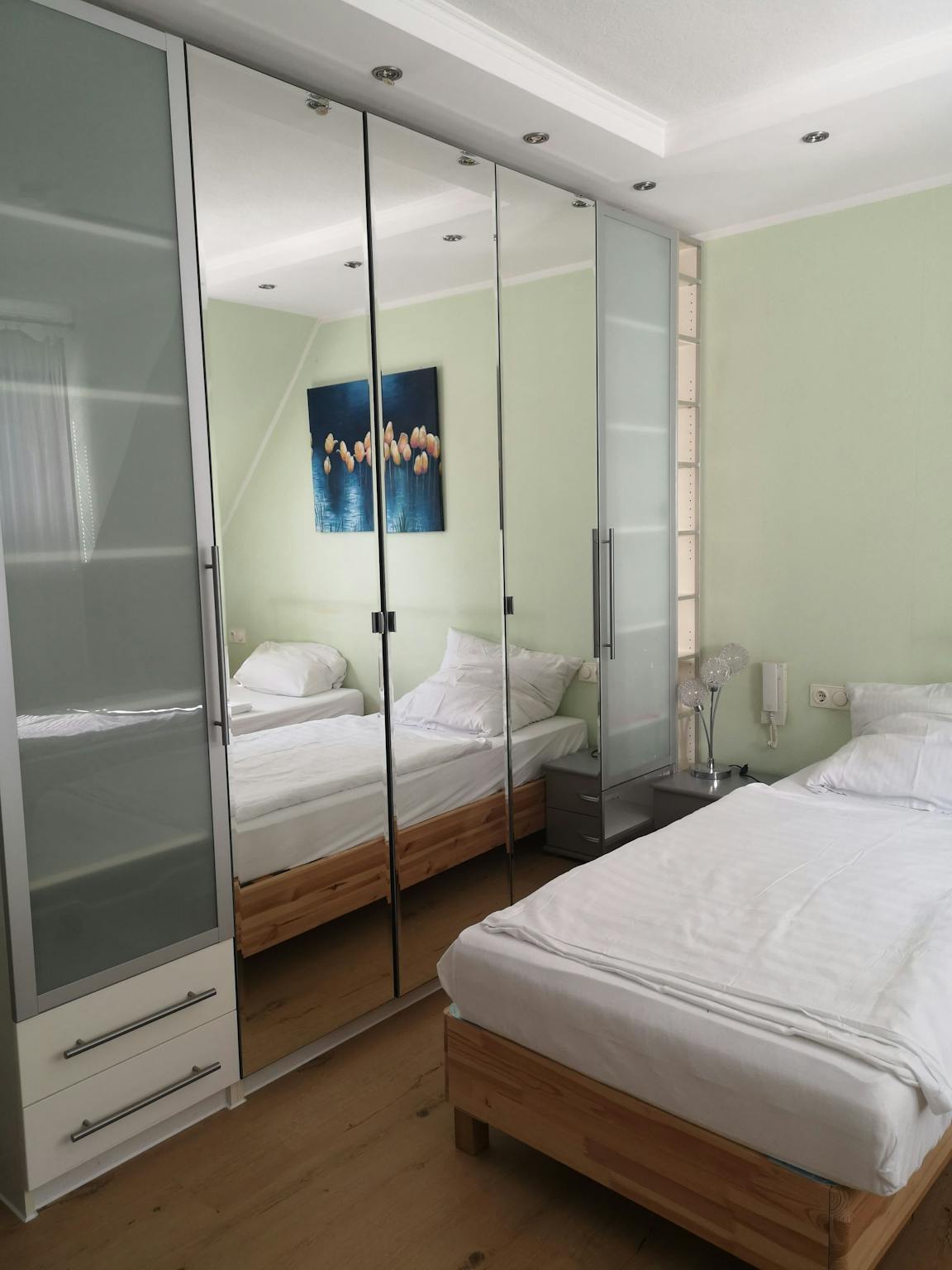 Die Wohnung befindet sich im 2. Obergeschoss eines gepflegten Gästehauses in Düsseldorf Rath. Eine helle hochwertig möblierte, 45m2 große 2-Zimmer-Wohnung mit allem, was man für den Alltag benötigt. Sie verfügt über eine komplett ausgestattete „löffelfertige“ Küche mit einem Kühlschrank, Mikrowelle, Backofen und Ceranfeld. Es gibt ein WC/Badezimmer mit Dusche. Im Esszimmer steht ein großer Tisch aus Buche mit 5 Stühlen und 2 Vitrinenschränken zur Verfügung. Beide Schlafzimmer verfügen über jeweils zwei Einzelbetten.