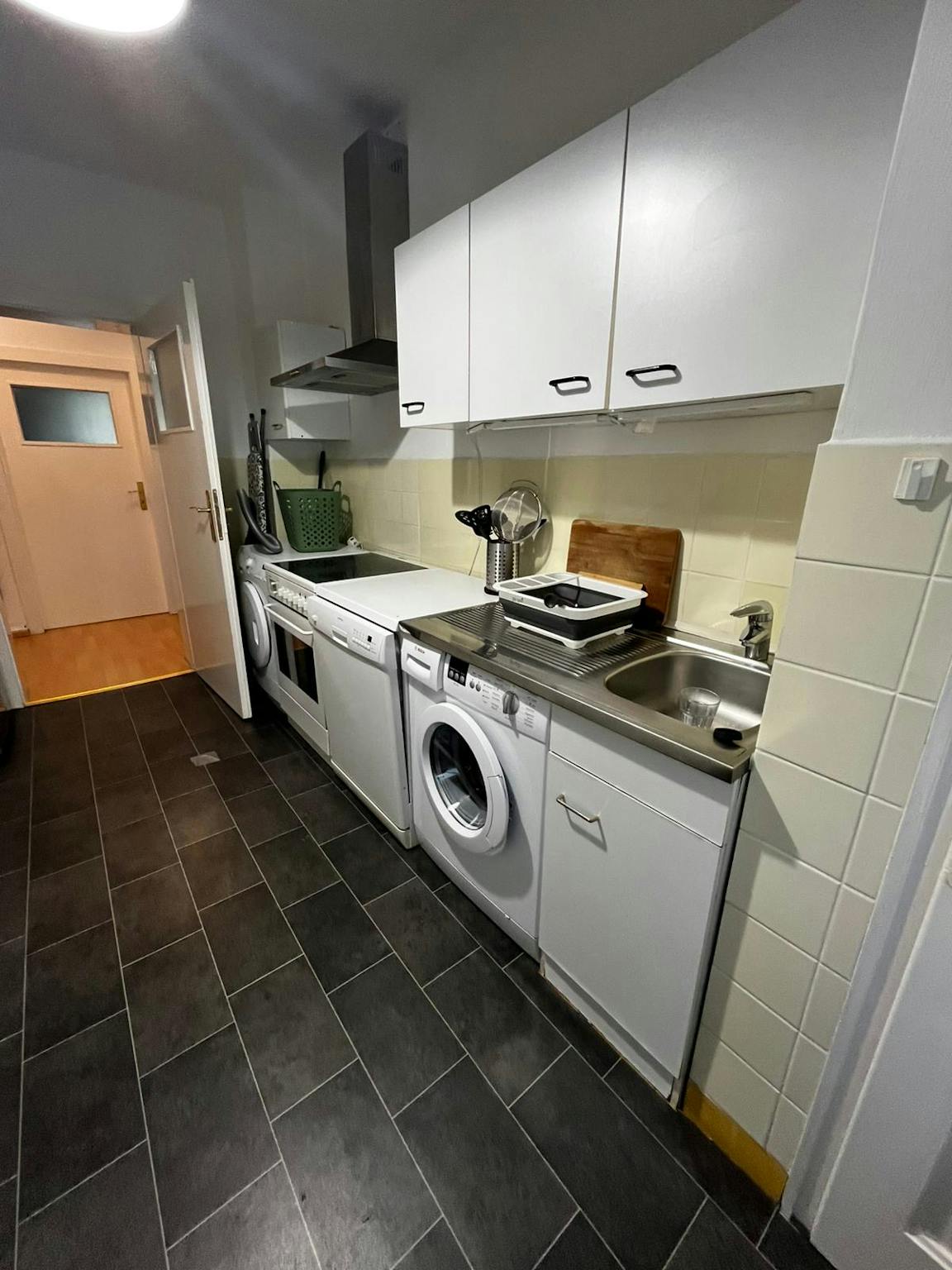 Außerdem findest Du einen Kleiderschrank für Deine Garderobe, einen Tisch und Stuhl für Arbeit oder Studium, ebenso wie einen SMART TV (55 Zoll) für Deine Unterhaltung. Die Küche ist perfekt, um hausgemachte Mahlzeiten zuzubereiten. Teil der Ausstattung sind Waschmaschine mit Trockner-Funktion und Spülmaschine.