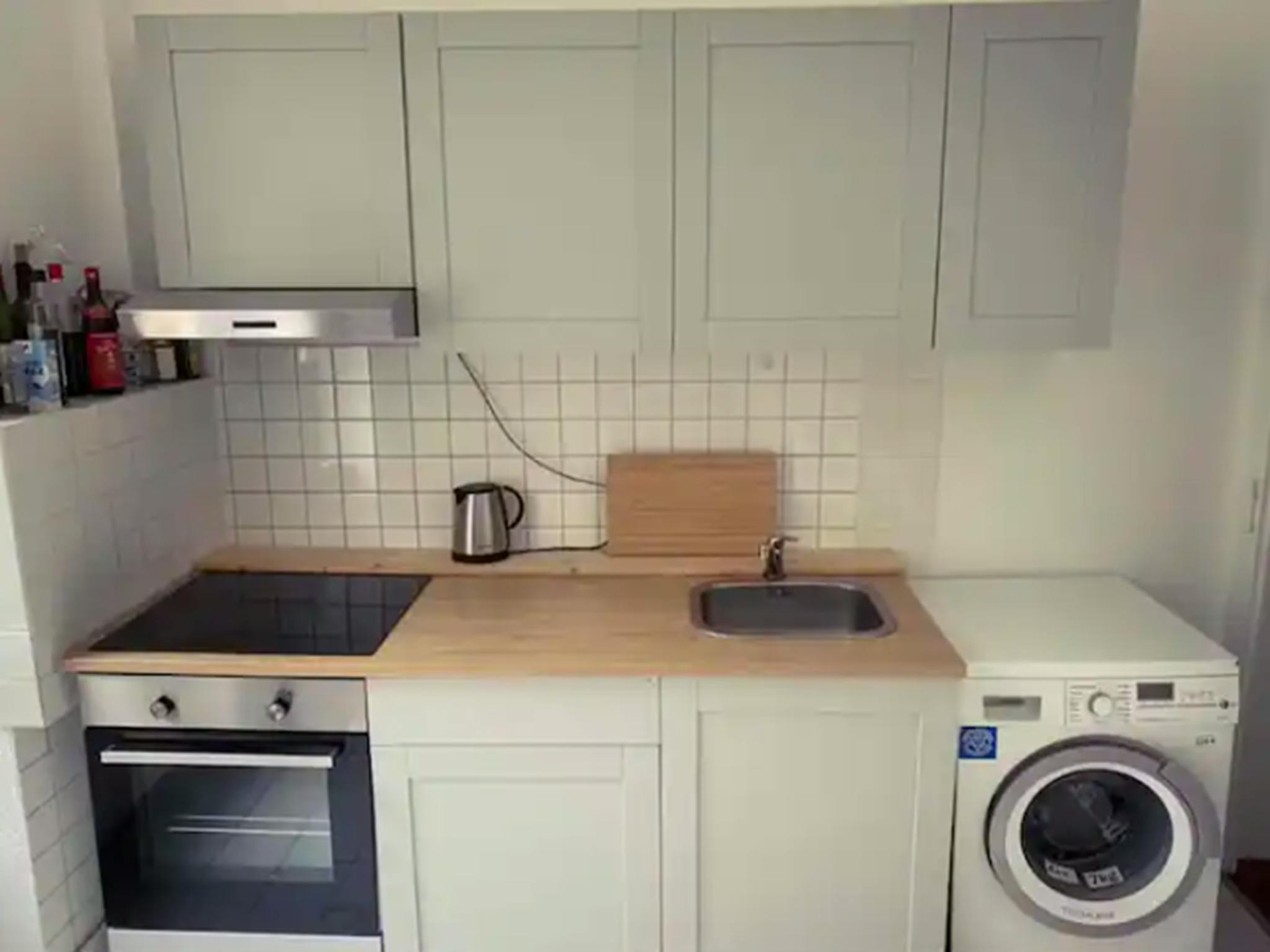 The apartment has 3 bedrooms. Each room is equipped with a box-spring bed with fine bedding, two bedside tables, one bedside lamp, a large closet, a working desk with a corresponding chair. In addition, there is a large elegant kitchen furnished with a cozy kitchen seating corner. Moreover the kitchen has all the necessary cooking equipment and utensils. The fridge of the kitchen is large and has enough space to keep the food fresh. There is also a freezer, an oven, a stove, and a washing machine in the kitchen. The bathroom is very spacious and elegant with a bathtub shower and a mirror sink. Furthermore, there is also a large couch in the hallway.