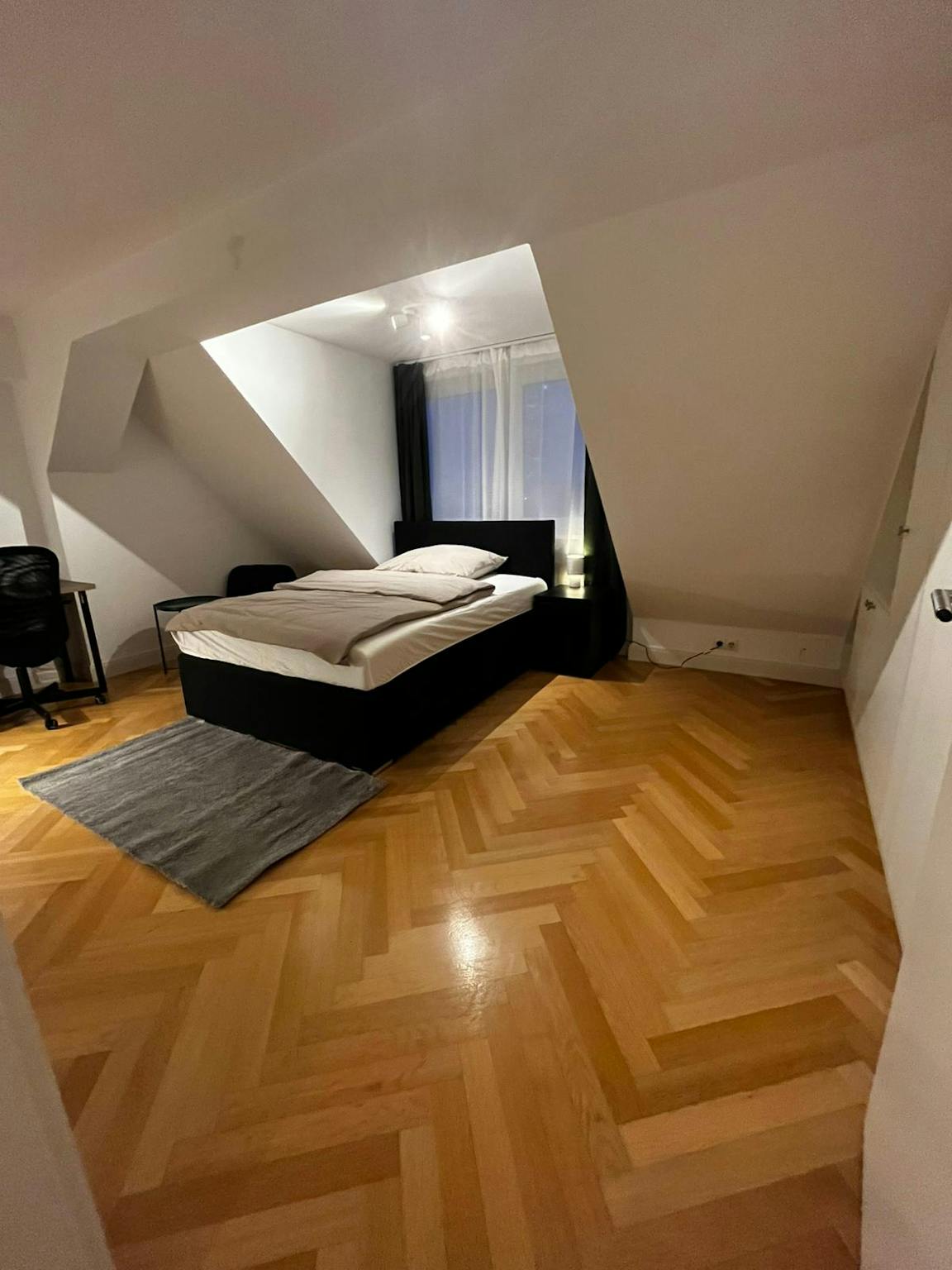 Ein großzügiges und praktisch eingerichtetes WG-Zimmer schafft eine „Wohlfühl“-Atmosphäre, sobald Du das Zimmer betrittst. Für einen erholsamen Schlaf steht Dir ein Boxspringbett mit den Maßen ca. 1,40m x 2,00m zur Verfügung sowie Bettdecke, Kissen und Bettwäsche.