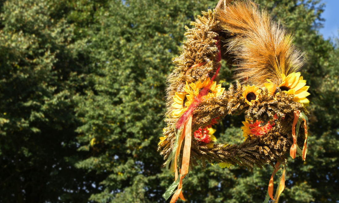 The harvest crown (Erntekrone) is a tradition that has carried through from pagan times. Traditionally, it was made from the last sheaf of wheat brought in at the end of harvest and given to the landowner. The handover ceremony included a church blessing and singing, dancing and food. Over time, the sheaf transformed into a wreath, and nowadays it looks more like a typical crown.